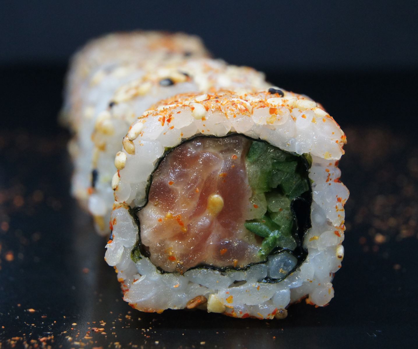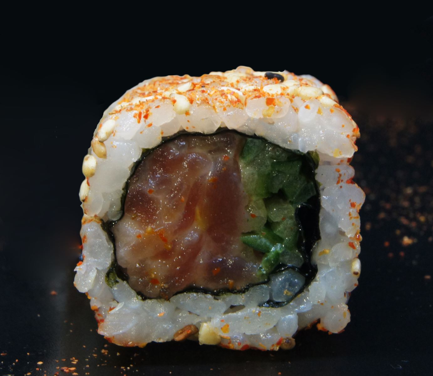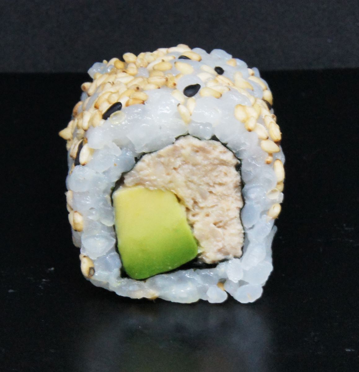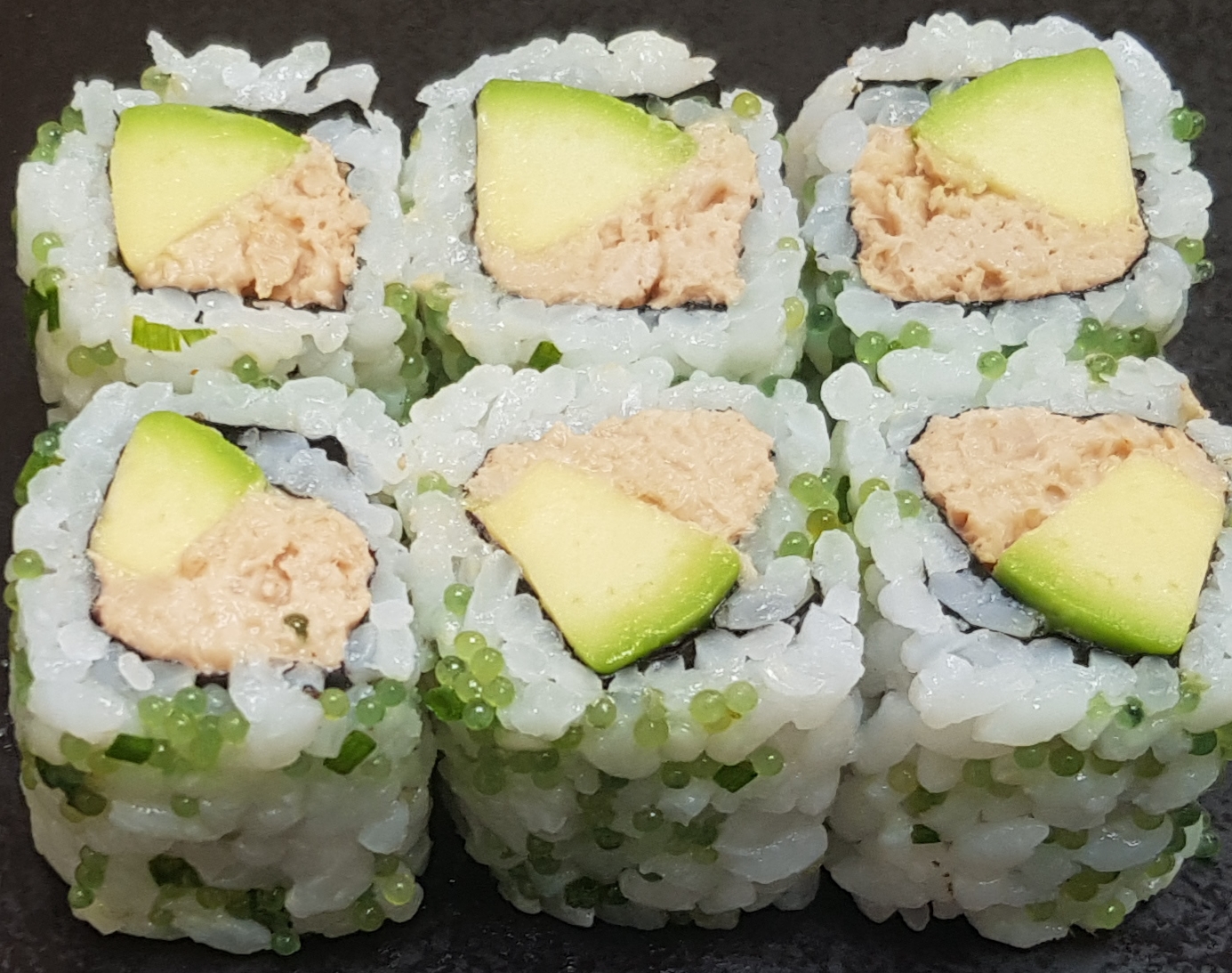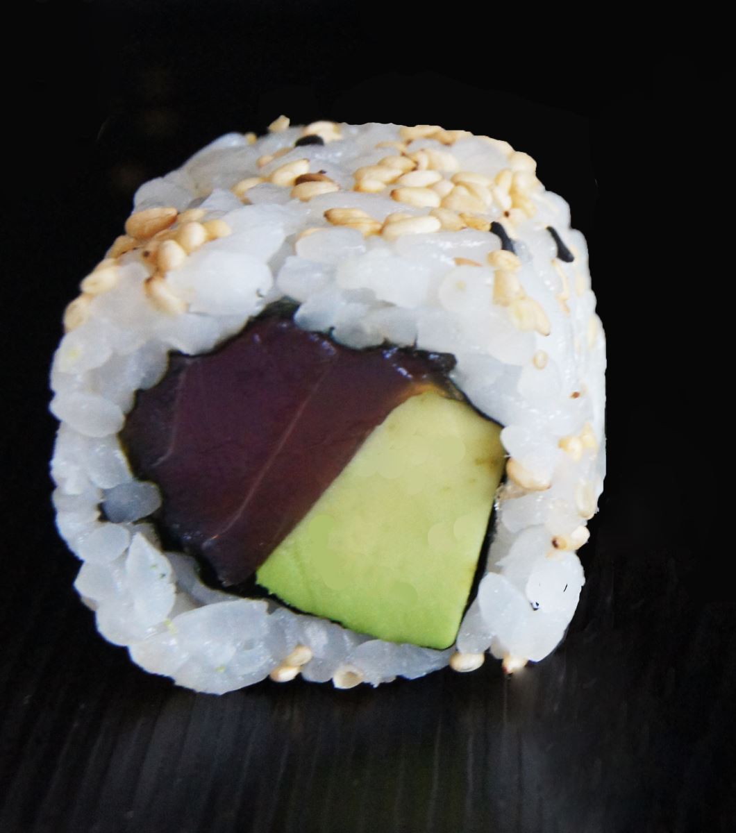Riz, sésame, algue, thon cuit, tobiko wasabi, avocat, ciboulette.