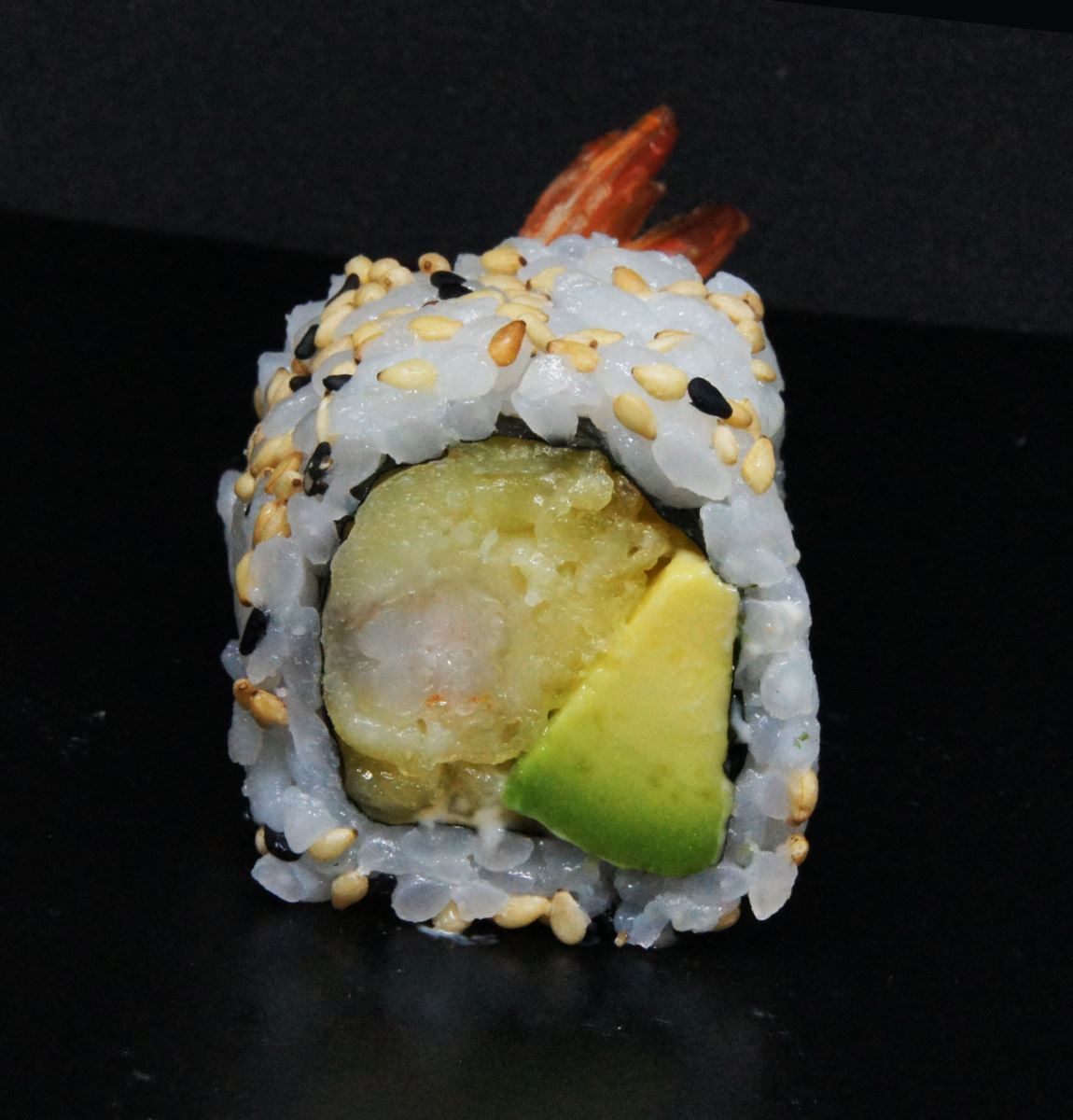 Riz, sésame, algue, avocat, crevette tempura, mayonnaise spicy