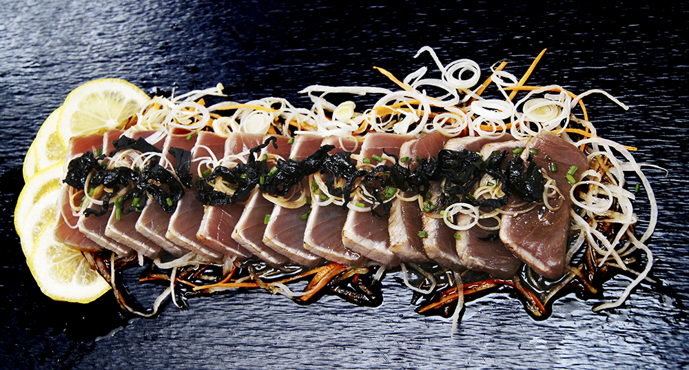 Thon snacké, poireau, ciboulette, algue séchée, navet blanc, carotte, citron, sauce spéciale tataki
