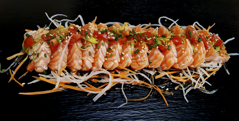 Saumon snacké, sésame, tomate, poireau, ciboulette, navet blanc, carotte, sauce spéciale tataki